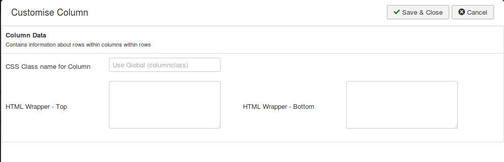 You can set a CSS class name for the column output (in addition to the class name used by your output framework) and the HTML wrapper you want to surround your column.