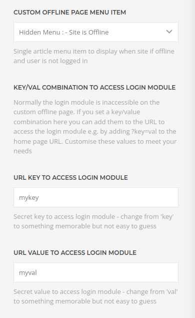On the 'Error and Offline Pages' pannel select the hidden menu item you created. You should also set an offline key/value combination e.g. offkey and offval. This will allow some magic to occur (explained below).