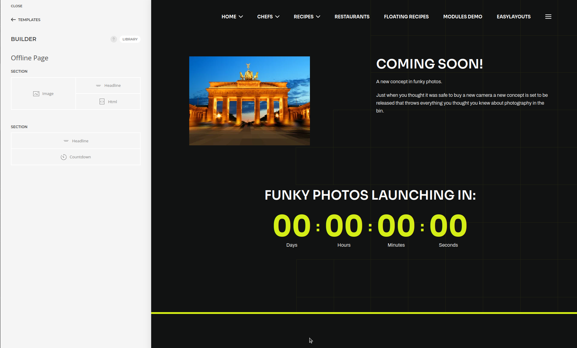 Using YOOtheme you can now customise this offline menu item using the Template Builder. The menu item specific templates addon is helpful to allow us to force YOOtheme to use this layout on our offline page.